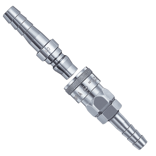 有優(yōu)越通用性的快速接頭,可用于從工廠(chǎng)的空氣配管到空氣工具的軟管 連接的各類(lèi)用途。 ●鋼鐵材質(zhì)適用于空氣,黃銅、不銹鋼材質(zhì)適用于水。 但是,分離時(shí)流體從插塞一側(cè)流出來(lái),敬請(qǐng)注意。 ●鋼鐵材質(zhì)的重要構(gòu)成部件經(jīng)過(guò)熱處理增加了強(qiáng)度。有良好的耐磨損性和耐久性。 ●主體材質(zhì)與尺寸種類(lèi)豐富,安裝形狀標(biāo)準(zhǔn)化,可用于廣泛的空壓用途。